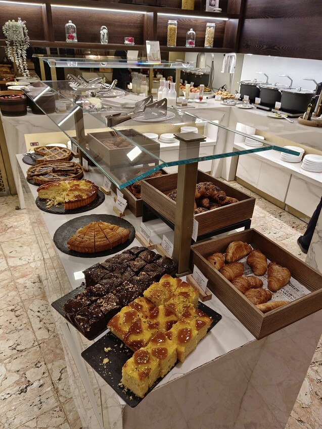中間擺的是應有盡有的糕餅台,不論你想吃蛋糕,可頌還是派,全部都任君選擇,如果是麵包控來歐洲可就開心了