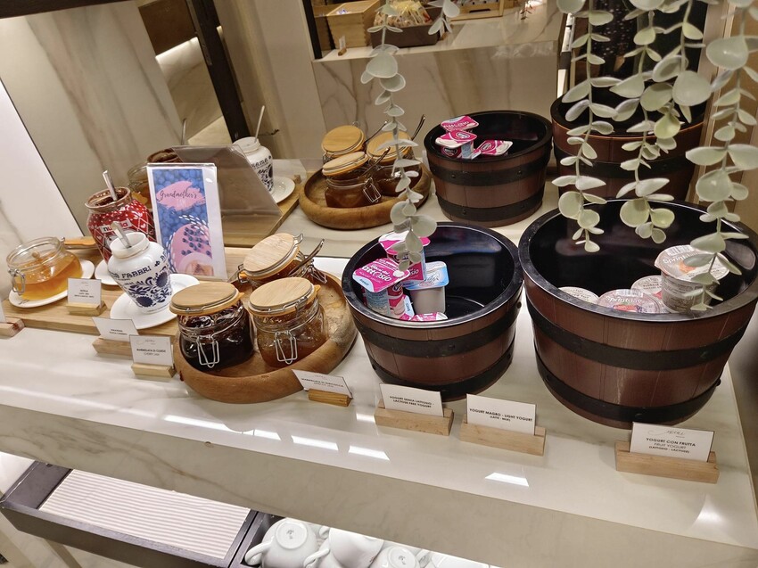 旁邊的抹醬區也是五花八門,除了各種果醬,還有蜂蜜和巧克力醬,最右邊二個圓桶內裝的則是優格