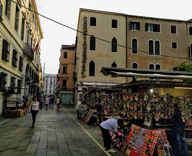 如果從威尼斯的聖露西亞火車站過來,只要沿著石板路一直走,就能抵達Hotel Continental,飯店前的空地上還有幾個專門擺攤的印度人在販賣威尼斯的紀念品,從早擺到晚,可說是相當勤奮