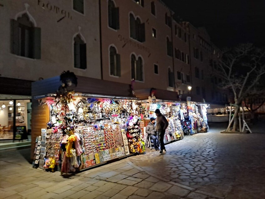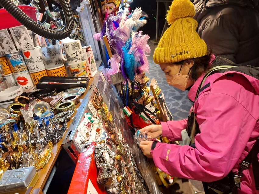 但是印度人的攤位還開著,尼侃侃,人家搶錢真是毫不手軟啊!而且他們賣的東西五花八門,小至威尼斯磁鐵,大至各種面具和行李箱,真是應有盡有呢!