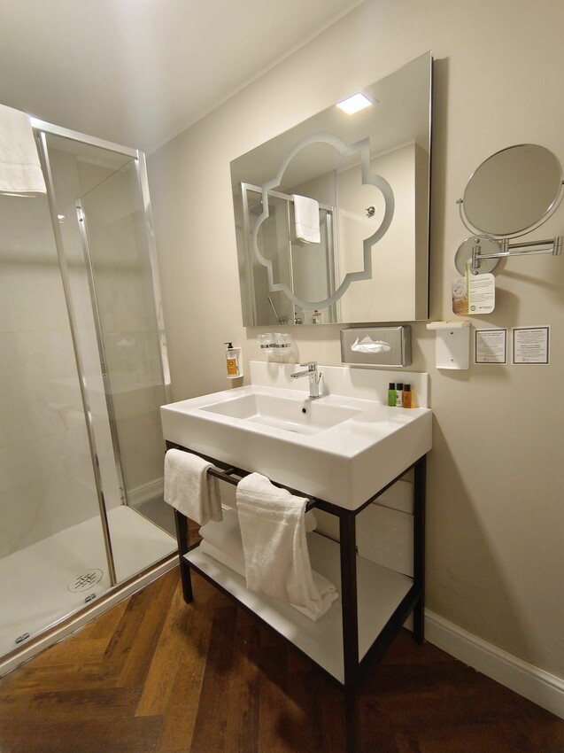 浴室的空間也不小,洗手台上還有幾瓶小的衛浴備品,比起前面幾晚的環保旅店,Hotel Continental似乎跟它們都不在一個檔次。不過浴室依然沒有浴缸,只有乾溼分離的淋浴間