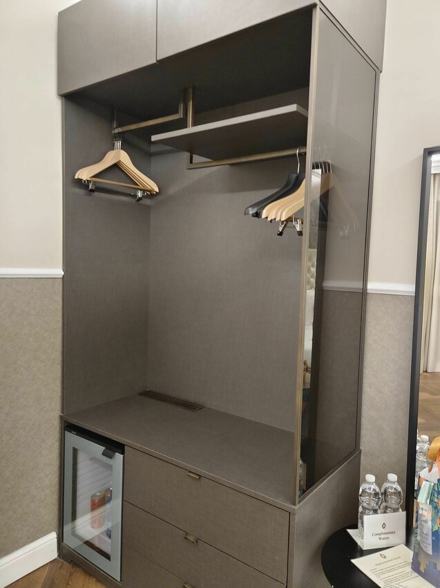 開放式衣櫥和下面的透明小冰箱是一體成形,雖然沒有門,但有好幾個衣架可以掛衣服,旁邊的小茶几還被我們拿來當放戰利品的地方,剛好可以擺我們在蕾莉歐買的保養品