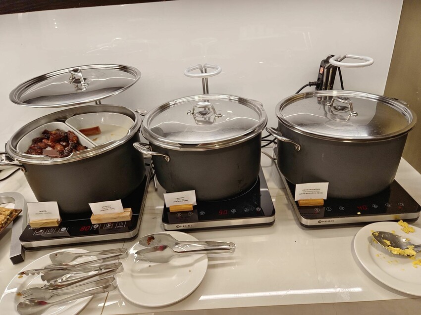 電磁爐上保溫的是各種熟食,包括培根和臘腸,還有炒蛋類,雖然豐富程度跟台灣的星級飯店沒法比,但已經算水準之上了