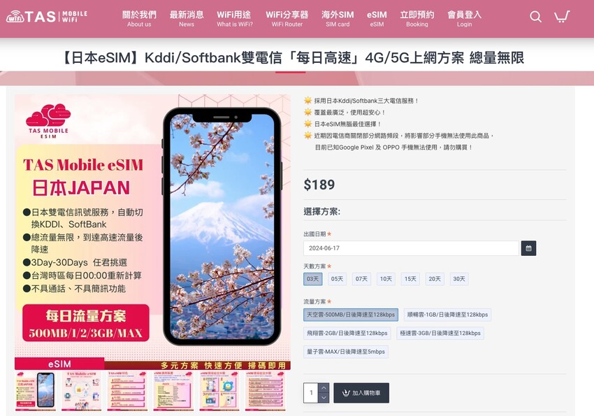 TAS Mobile WiFi的預約方式相當簡單,直接上官網選擇eSIM,目前只有日本地區可以選擇,未來會有更多國家,選擇流量、天數等等,就可以算出租借金額,最低一天只要159元~