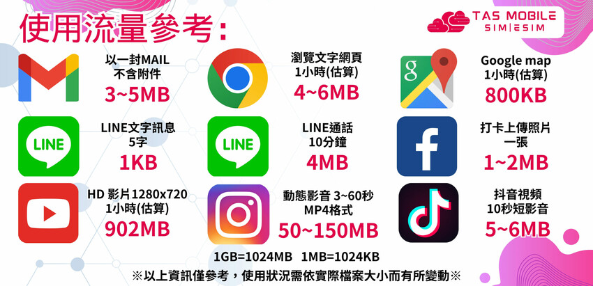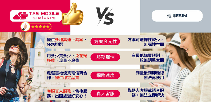 TAS Mobile提供了多種高速上網方案,想要多少流量就選擇多少流量,有1~30天的選擇,用多少買多少,沒有最低購買限制,與當地電信配合網路穩定,客服也是真人服務,出國隨時可以解決問題超快速