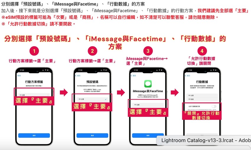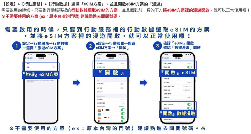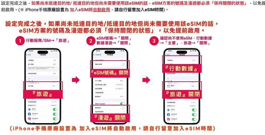 設定完後還未出國使用網路,先將eSIM漫遊與號碼關閉,以免提前啟用唷!!