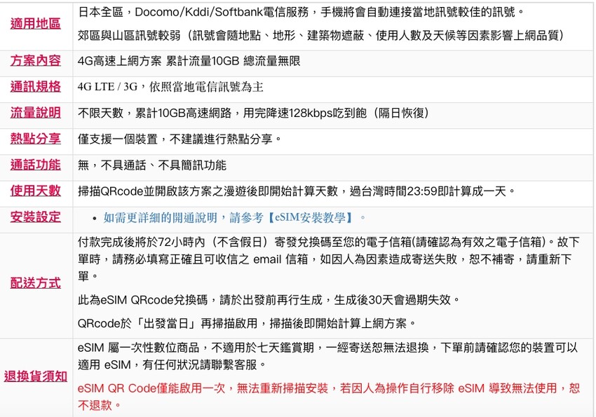 個人選擇了七天,流量部分不論是500MB~3GB、5GB、10GB等,當天累計到達流量後,會將速成128kbps吃到飽,也可以參考使用流量,下單後會提供QR code,出發當日再掃描啟用就可以了,掃描後即開始計算上網方案