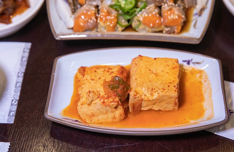 這裡的醃蟹有兩種,一種是醬油蟹,一種是辣椒醃漬,我們每個人各點了一份,所以這一盤是四人分,一人一隻的量。看了網路的介紹,好像也有提供醬油蟹定食。