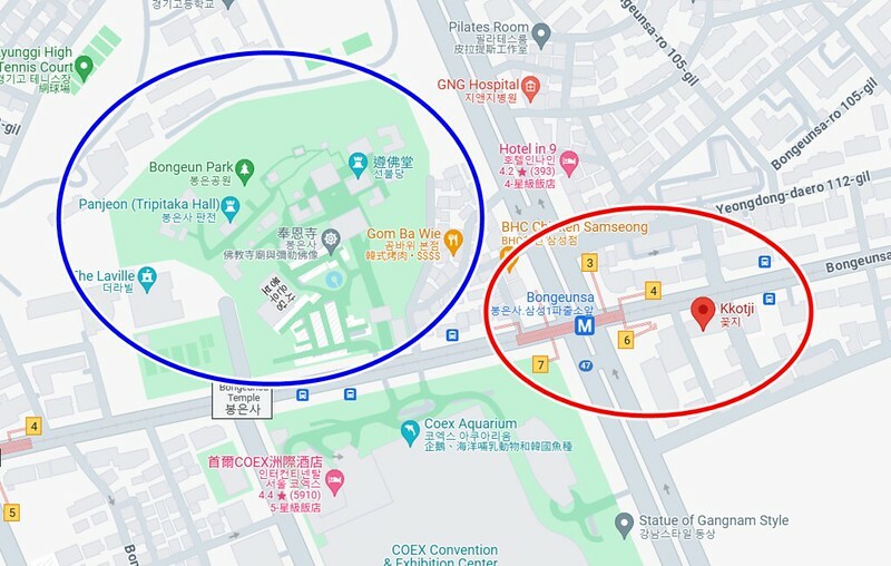 Kkotji (꽃지)位於江南奉恩寺,國人熟知的星空圖書館、Starfield COEX Mal、江南大叔手塑附近,從Samseong站6號出口步行不到一分鐘,交通算是算是十分便利。
