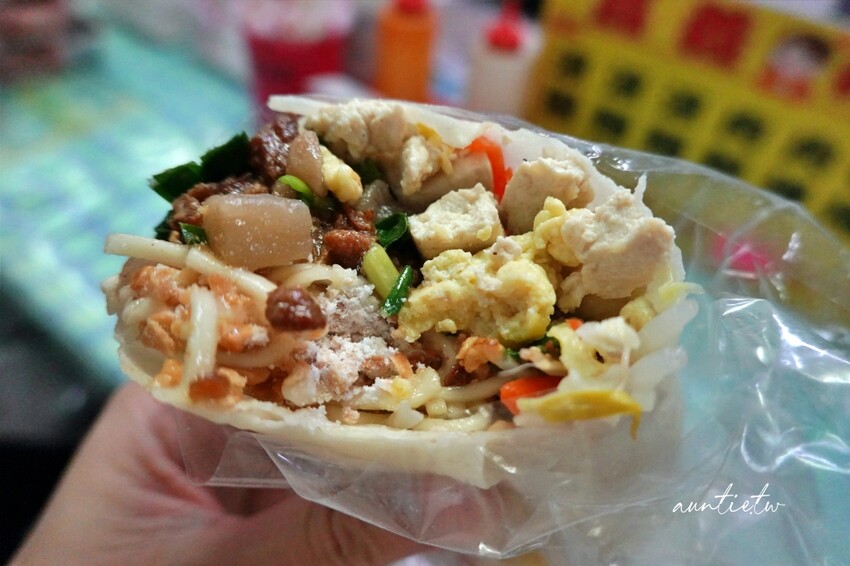 中間包的餡料很多,還加了油麵、肉燥、高麗菜、豆芽菜、蛋,以前還真沒吃過春捲包麵條的口味,加了麵條飽足感大大增加,春捲的皮也不會濕濕的,每個配料的味道都不會太搶戲,肉燥還吃得到肉塊。