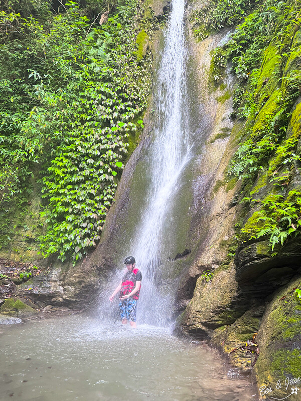 一伙人穿越樹林探訪不知名的瀑布,這個約二、三層樓高的瀑布也不算大,可以站在水下享受最天然的SPA呢!