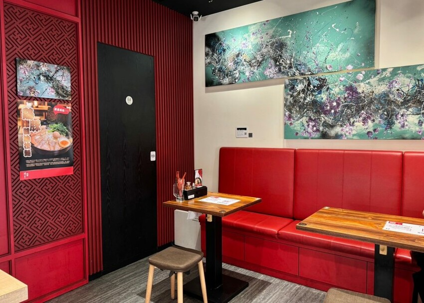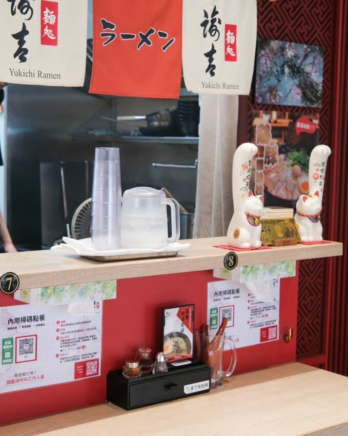 ▼【Yukichi Ramen 諭吉拉麵】用餐環境小巧精緻,分為吧台座位和兩~四人的沙發區,以紅白色調為主軸搭配日式擺設,整體裝潢充滿了濃濃日本風情!