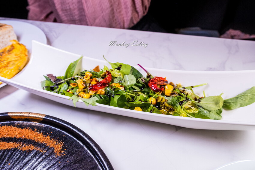 顏色繽紛的沙拉用了多種生菜下去搭配,裡面還有香甜玉米粒跟酸豆,讓口感跟味蕾跳脫出不一樣的滋味。淋上的是油醋醬汁,讓整體吃起來清爽許多,吃完沙拉後整個胃口大開了~