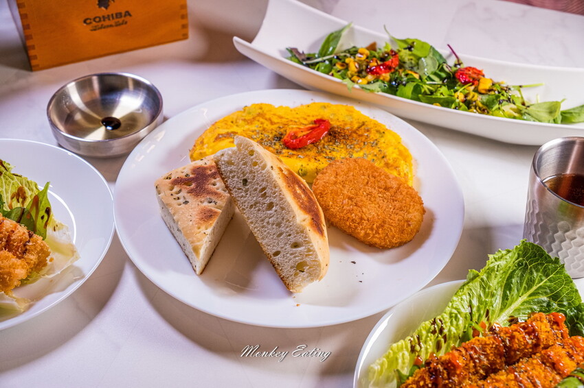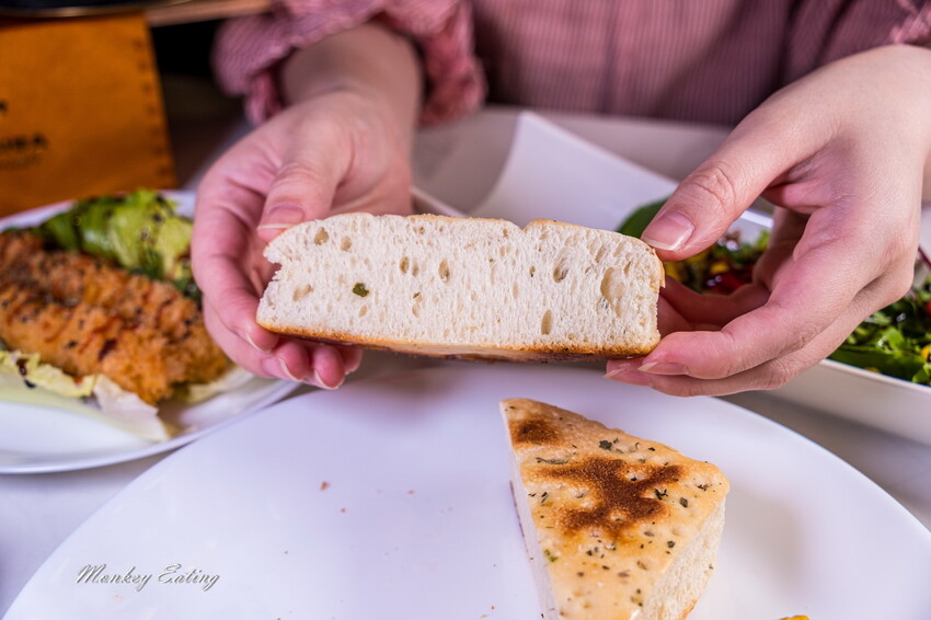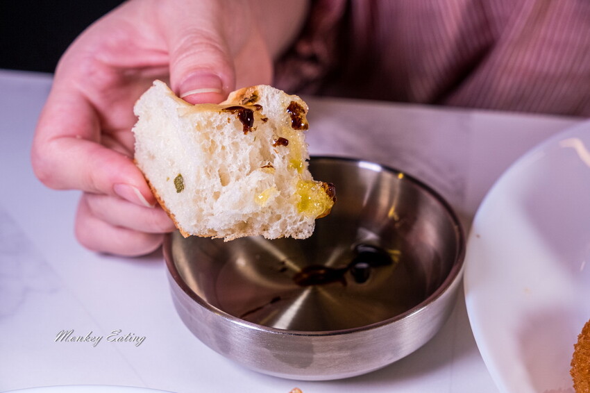 佛卡夏麵包是用橄欖油下去烘烤的,烤的相當酥脆,裡面是軟綿帶Q勁的口感,非常好吃。可搭配附上的油醋橄欖油,吃起來會多了一點淡雅的橄欖油香,麵包整體的風味也更有層次感。