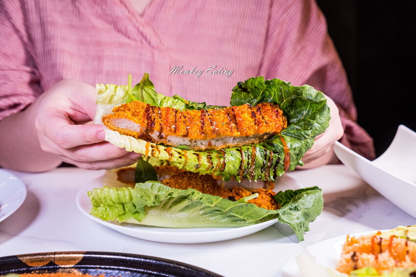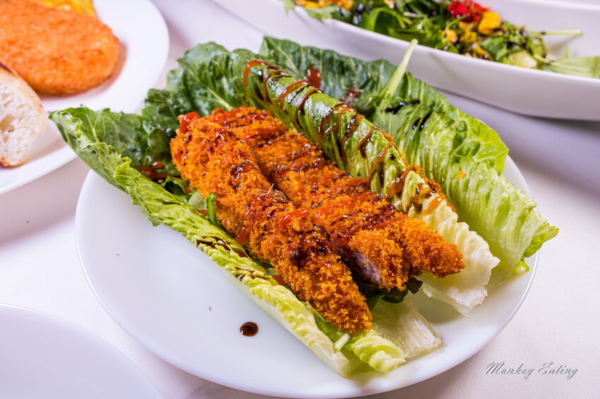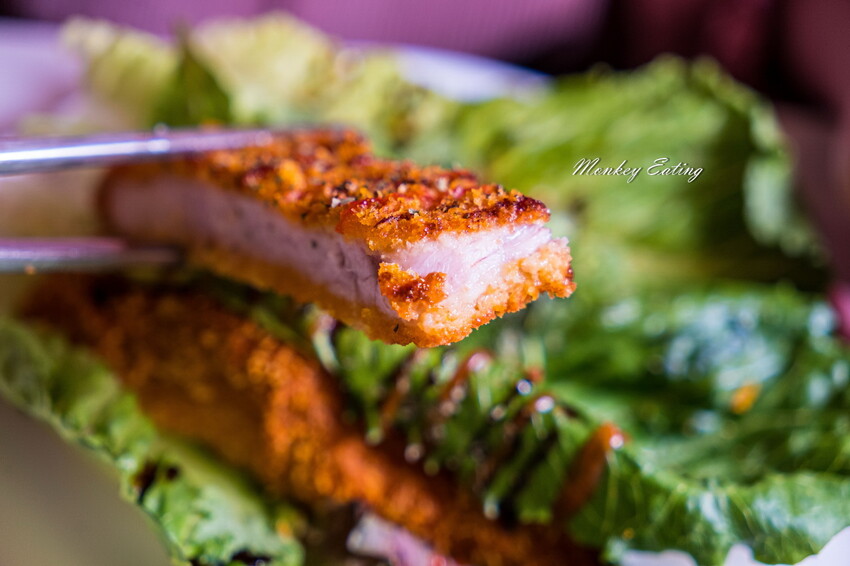 看看這黃金炸豬排份量也是一點都不小氣,酥脆的外層以及那紮實的厚度,任誰都無法抵擋這個誘惑阿~豬排肉質很啾西,加上蘿蔓葉爽脆口感,佐醬也有畫龍點睛的功效,我跟朋友都很推薦必點一份炸豬排。