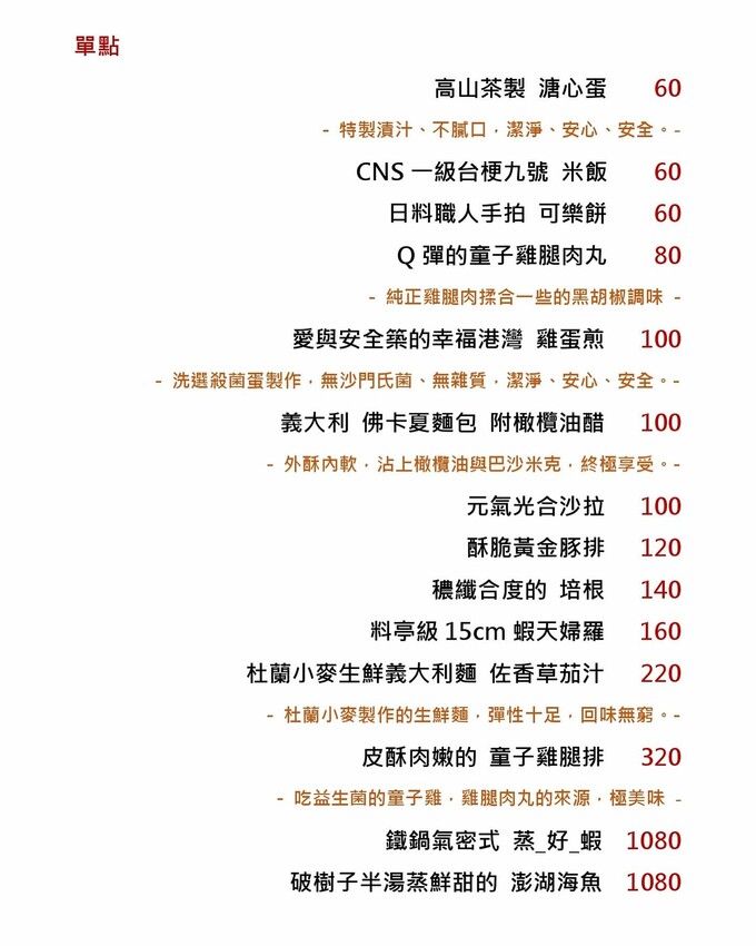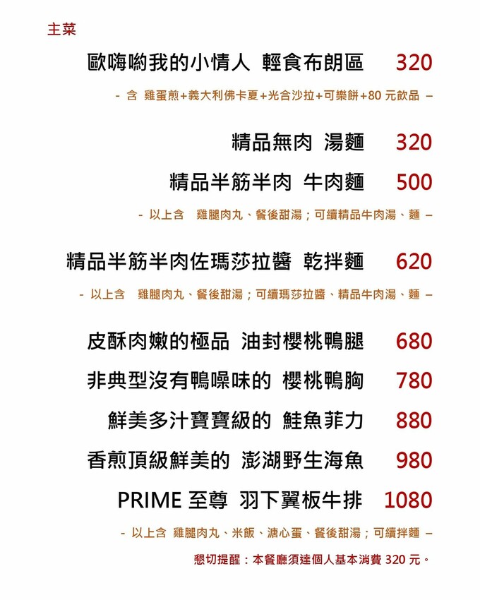 三生有幸點餐部分,每一個人是低消$320元,可以選擇套餐或單點。早午餐系列有超澎派的早午餐盤跟沙拉,主菜隨意搭配。另外排餐也是我個人相當推薦的,嚴選的肉品,羽下翼板牛排、櫻桃鴨胸的呈現完全不輸法式餐廳,加上這裡燈光美氣氛也很棒,也很適合來約會唷~
