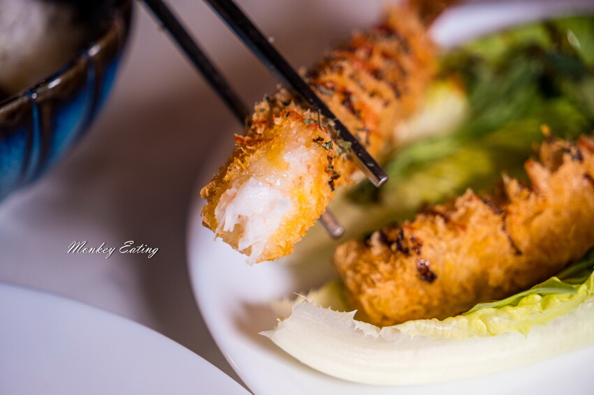 巨無霸大蝦天婦羅,每隻都是新鮮嚴選的大蝦,去頭裹粉下去炸到金黃酥脆,咬下去卡滋作響,依然保有蝦肉原有的彈牙口感,可以搭配蘿蔓生菜葉包著炸蝦一起吃,整體會清爽許多喔~