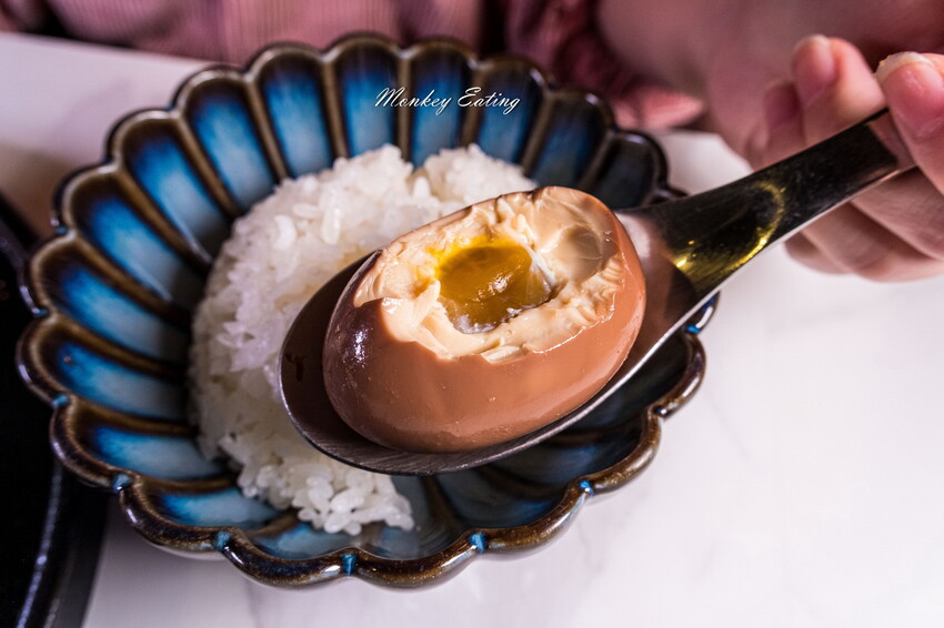 點選排餐會附上一碗白飯,裡面有精選高山茶泡製的溏心蛋,蛋白散發著淡雅的茶香味,最精華的還是裡面濃稠液體狀態的蛋黃,冰涼口感中帶著濃郁的甜甜蛋香,拌著米飯吃也別有一番風味。
