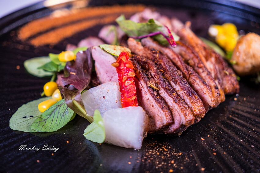 鴨胸外皮焦脆,裡面保有肉質軟嫩的口感,還有豐富的肉汁,主廚在下刀時也都格外小心,防止肉汁流失。