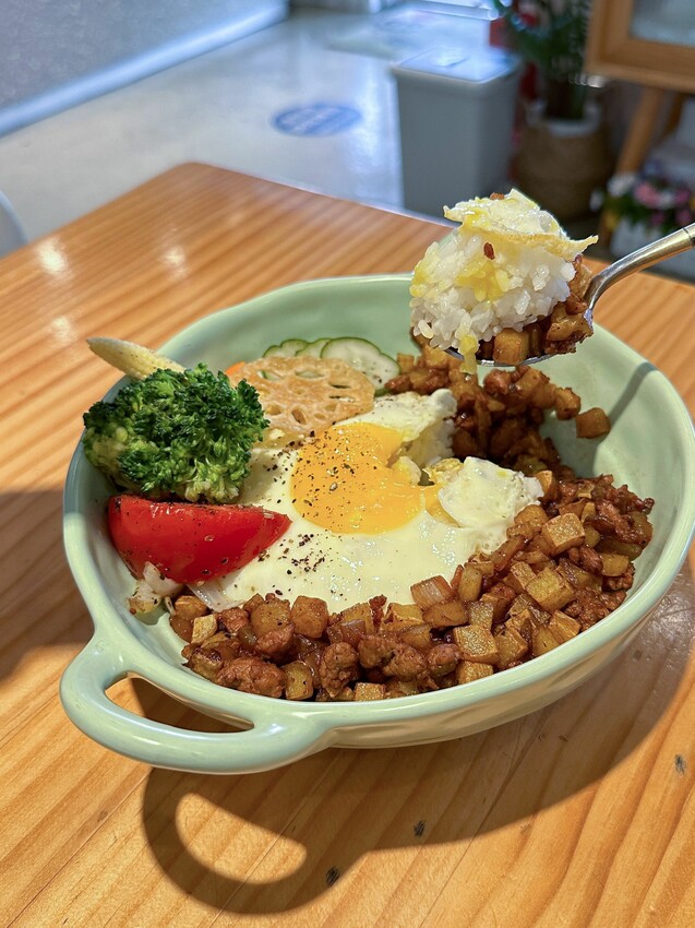 馬鈴薯+豬絞肉+洋蔥再配上一顆半熟蛋,看起來就好好吃!挖一口都要配著飯一起吃,鹹度適中、吃得到洋蔥的甜、不乾柴的肉塊,整體不會太油膩