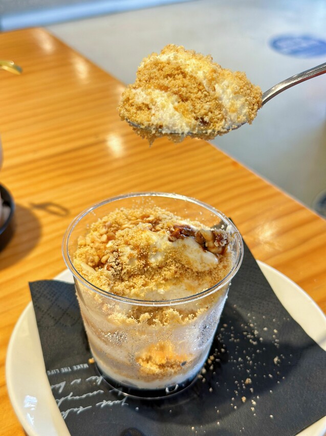 吃起來口感超特別,一層酥酥的餅乾屑、一層軟綿慕斯,甜度不高,吃起來鹹鹹甜甜、酥酥的好好吃!