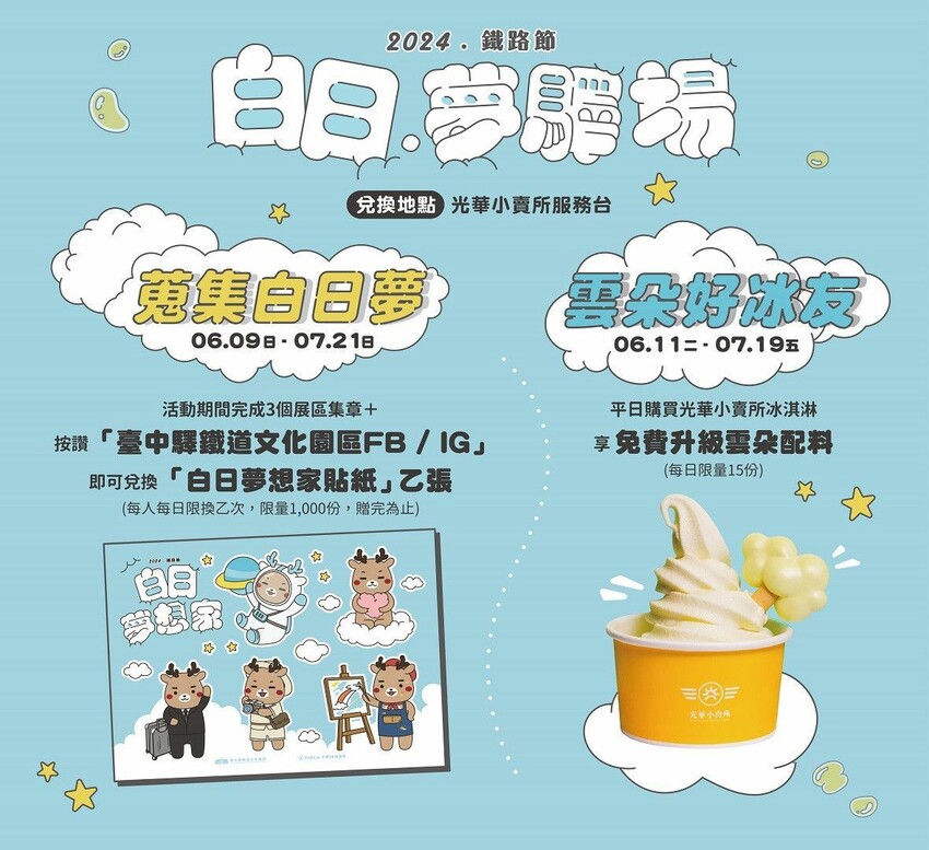 活動期間完成 3 個展區集章+按讚「臺中驛鐵道文化園區 FB 或 IG」,即可兌換「白日夢想 家貼紙」乙張