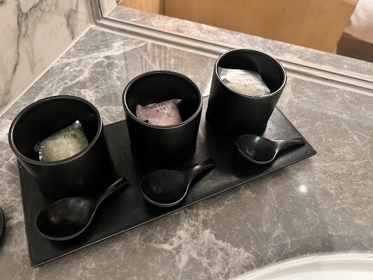 淋浴間有浴缸,浴缸旁提供三種香味的沐浴鹽,
