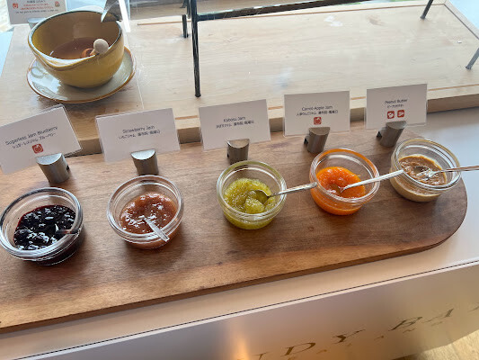 提供蜂蜜、以及各式果醬可以搭配麵包享用。