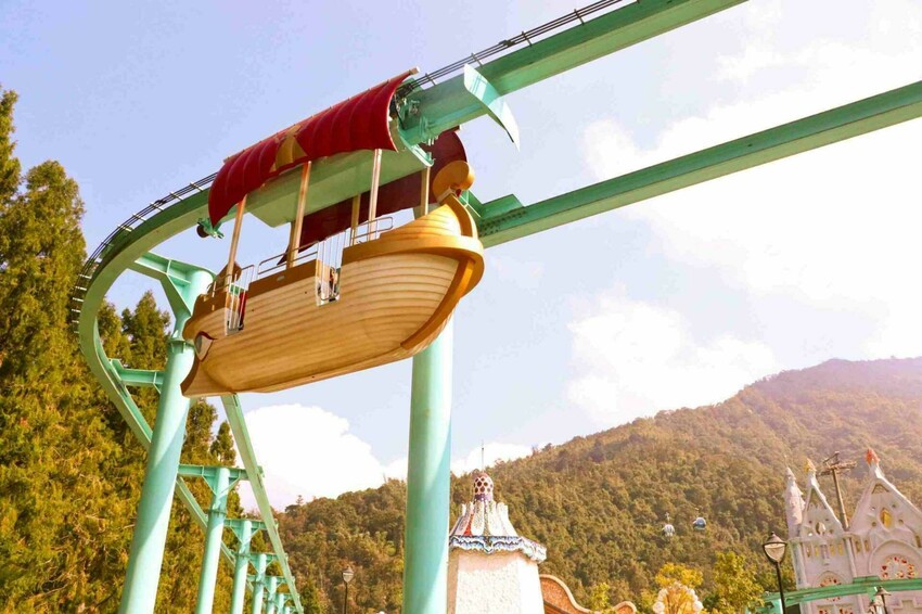 最後,就是從空中搭纜車就可以看到的無敵艦隊(水上雲霄飛車)了,爬升30公尺高,先後退倒衝,再轉正下衝,激起巨大的水花!喜歡刺激的你們可不能錯過這項設施。