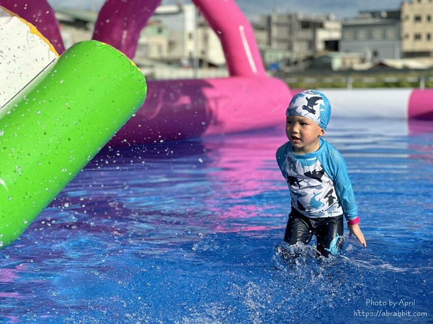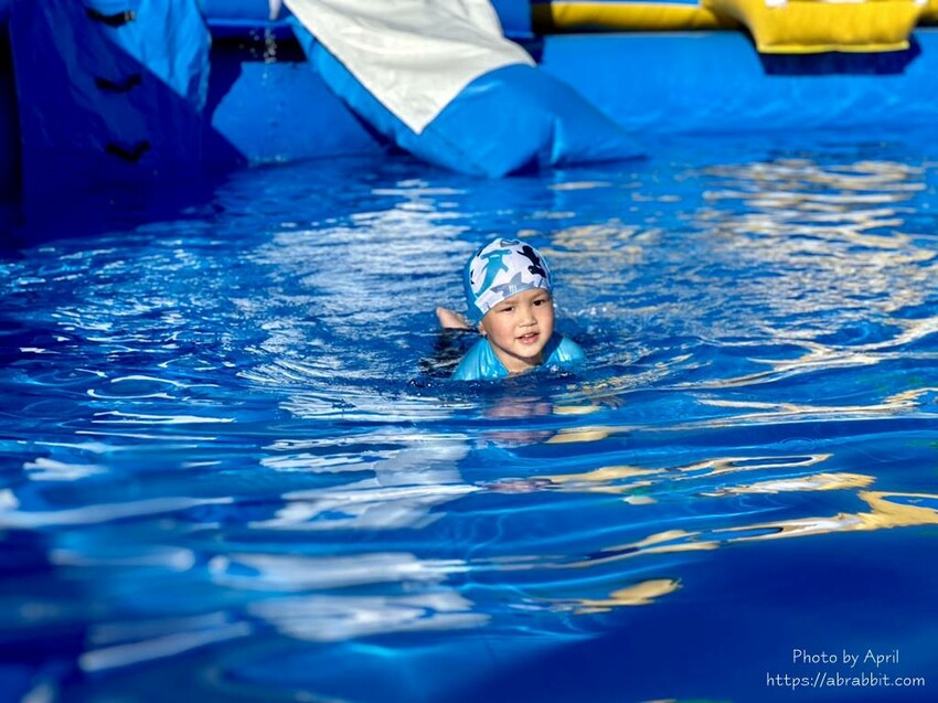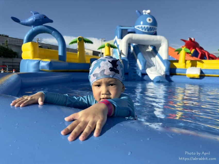 夏天怎麼能不玩水咧?建議家裡有泳圈、水槍都可以帶著,沒有這些玩水器具也沒關係,因為設施裡面就有很棒的溜滑梯、泡泡池等,小朋友玩水就是開心,我們看著也跟著開心。