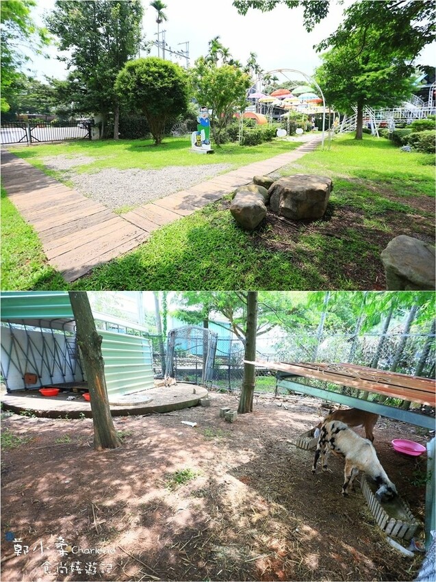 ▲▼彩虹雨傘步道旁,設有可愛動物區,有羊咩咩和土雞可互動拍照。