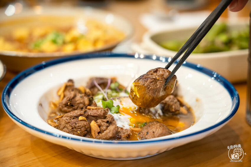 淋在飯上的牛菲力奶油燒醬汁很下飯,鹹香鹹香的滋味很美味,蒜片酥脆清香,每一口都很讚。