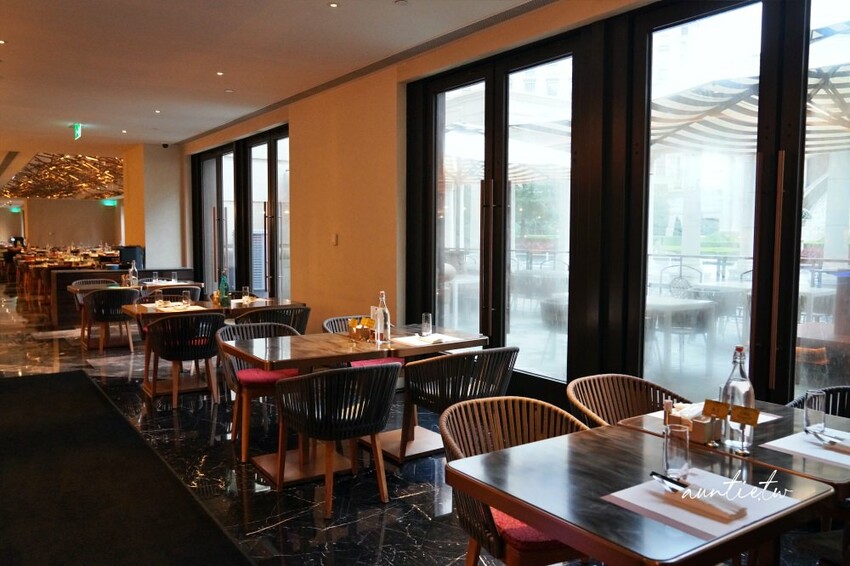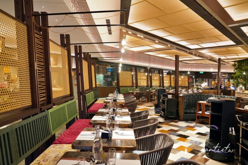 晚餐時間來用餐客人非常多,時間一到很多客人就直接在門口等待入場帶位,餐廳座位一邊是靠窗的園景區,另外一邊則是整圈的餐檯。