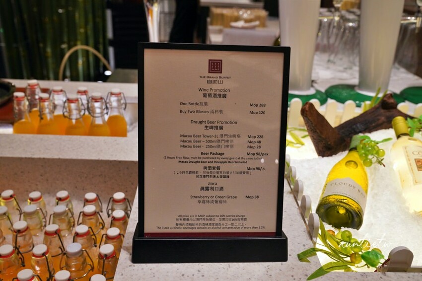 飲料種類更是眼花撩亂,果汁、茶飲、手打檸檬,想喝點小酒的也有另外付費的紅白酒、啤酒等酒精飲料。