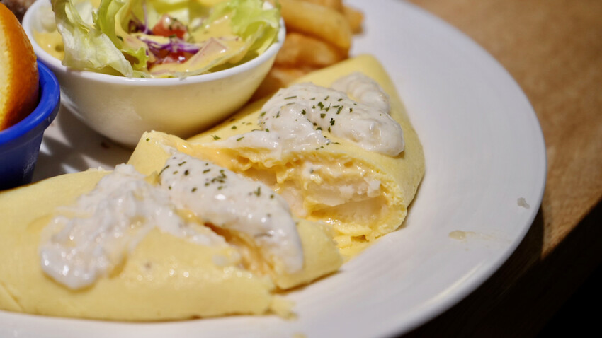 歐姆蛋中間包裹著軟嫩的雞蛋和馬鈴薯泥,吃起很滑順口感很棒!