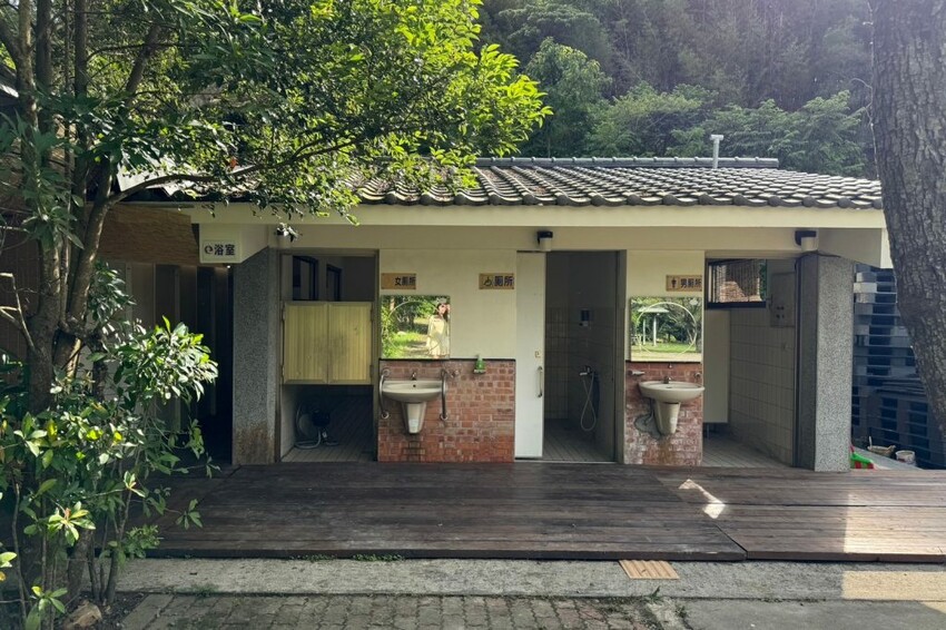 ▼【不遠露營度假山莊】野奢帳的浴廁空間是大家統一使用,提供沐浴乳、洗髮乳還有吹風機。