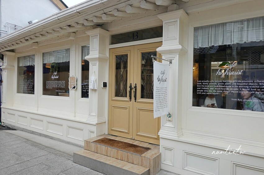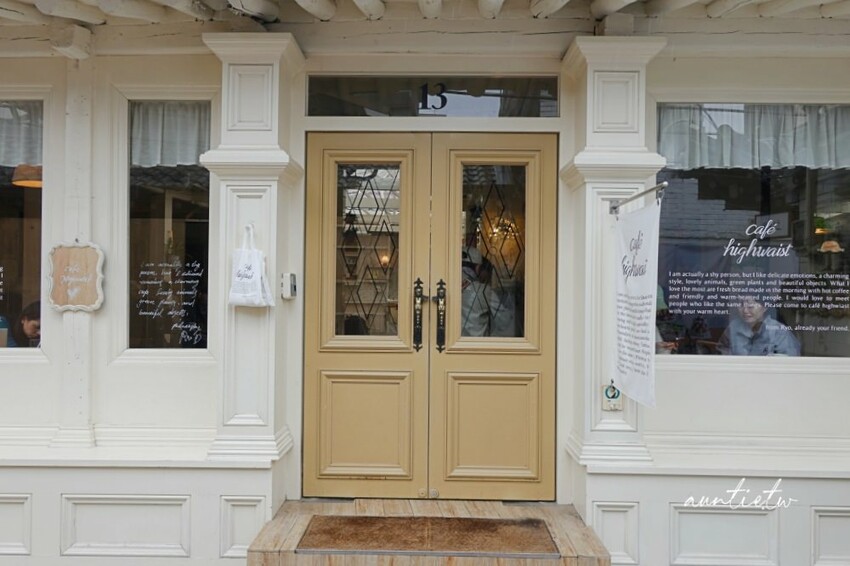 Cafe Highwaist 店門口帶點歐洲風格,看起來乾乾淨淨的很好拍照,跟周圍的韓屋建築有點差異,從外觀就蠻特別的,裡頭裝潢更是可愛,鄉村風格,有開放式的甜點麵包檯,要吃什麼自己夾。