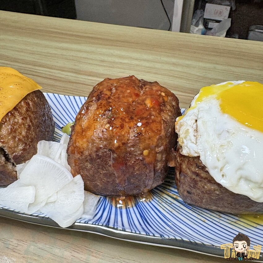 肉包飯一顆80元,有原味、黑胡椒、泰式和辣味,醬料另外裝,大家可以自行調整口味,可以加荷包蛋或起士。