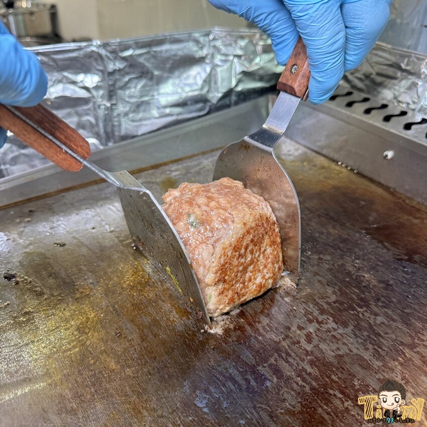 在鐵板上煎至金黃焦脆,看起來就像是巨型燒肉飯糰