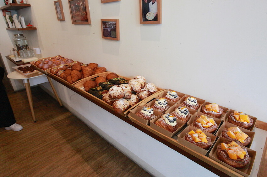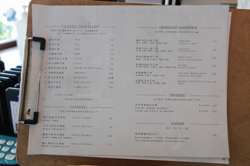 檯面上有芒果丹麥110元、藍莓丹麥100元、原味可頌70元、杏仁奶酥可頌75元、卡士達可頌75元、巧克力可頌75元、芋頭可頌75元、水蜜桃可頌75元........等等,小高覺得店家可頌定價不會偏貴。