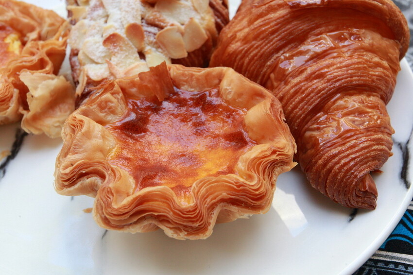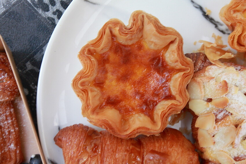 小高就買千層蛋塔160(2入)、藍莓丹麥100元、原味可頌70元及杏仁奶酥可頌75元等。