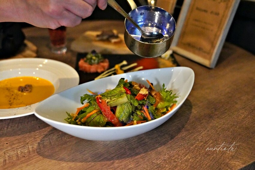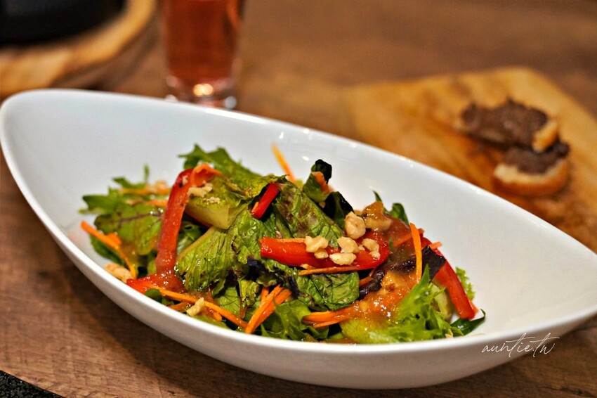 豐富五彩繽紛的季節時蔬沙拉,服務人員還會加入一點燃燒的橙酒到沙拉中提味,酒精燃燒過後,與沙拉將攪拌均勻,生菜沙拉吃起來只留酒香,又帶有點酸甜味,十分開胃。