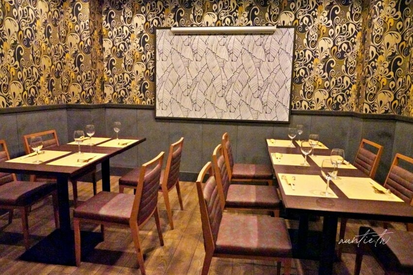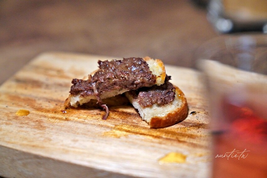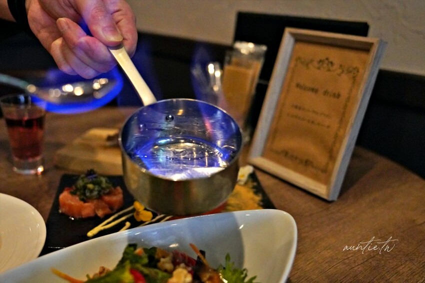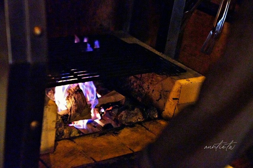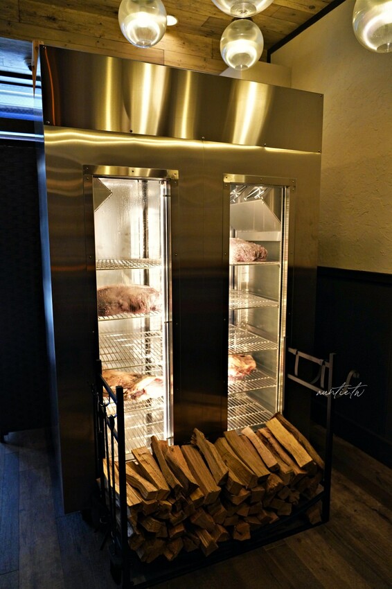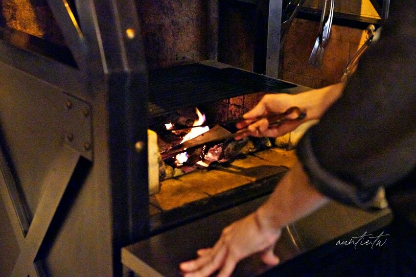 在享用牛排前,會先在一樓的迎賓區享用迎賓飲料以及開胃小點,提供氣泡酒及黑醋栗飲品,以及神戶牛抹醬法式吐司,服務人員會開始介紹菜單以及料理的特色外,還可以先用視覺、味覺享受柴火在一樓烤爐裡散發的溫暖燻香氣息,令人非常期待接下來的饗宴。