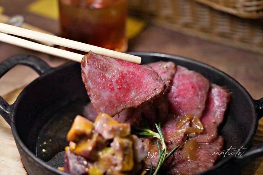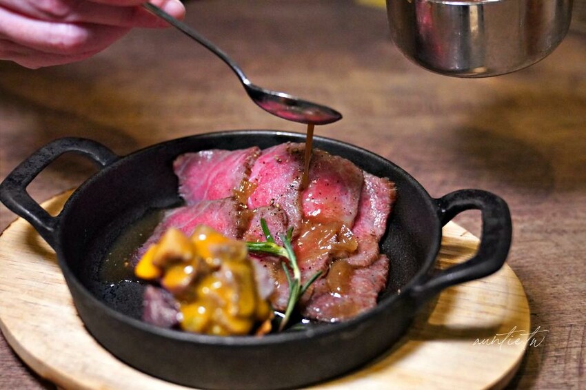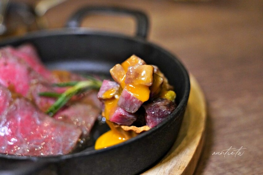 A5 熟成烤牛肉加入兩種醬汁,烤牛肉切片搭配洋蔥醬以及丁狀的骰子肉搭配蛋黃醬,烤牛肉切片品嚐起來肉香馥郁濃厚,香氣濃縮在一起,肉汁豐富;骰子牛肉口感很像生火腿培根,底下還有酥脆塔皮搭配,兩種不同風味的熟成牛肉品嚐起來雙重享受。