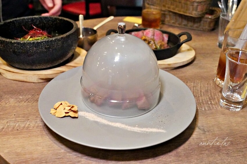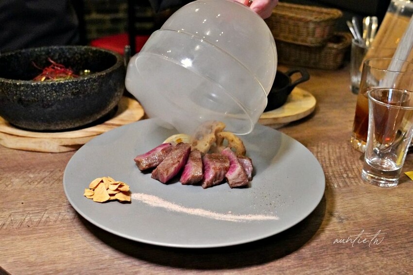 A5 神戶牛排則是以煙薰方式呈現,將神戶牛排與煙霧鎖在玻璃罐中,上桌後再掀開,完全充滿視覺與味蕾衝擊,煙燻牛排吃起來有木柴煙燻香氣,搭配淡路島洋蔥以及蓮藕,油脂非常豐富,肉質入口即化軟嫩到不行,色澤就像是紅寶石一樣在發光!A5 神戶牛排可以搭配玫瑰鹽、炸蒜片或是芥末、醬油一同享用,肉質真的是頂級到不行。