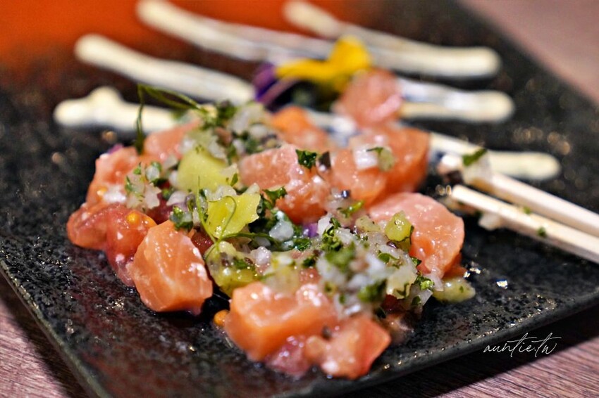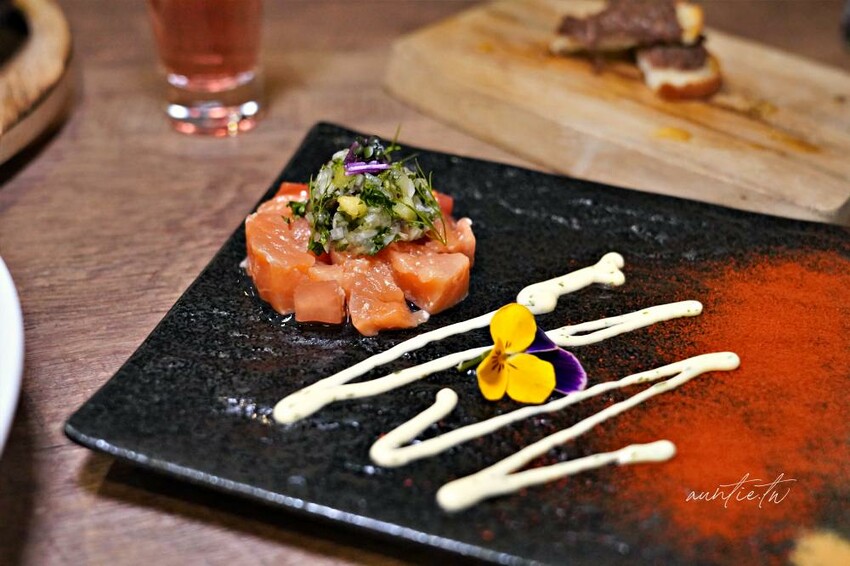 鮭魚做得像是生鮪魚塔塔一樣,以煙燻味的紅椒粉以及美乃滋搭配,煙燻鮭魚沾著煙燻紅椒粉一起吃味道十分迷人,吃起來有紅椒的溫暖香氣,又有冷盤的清爽口感。
