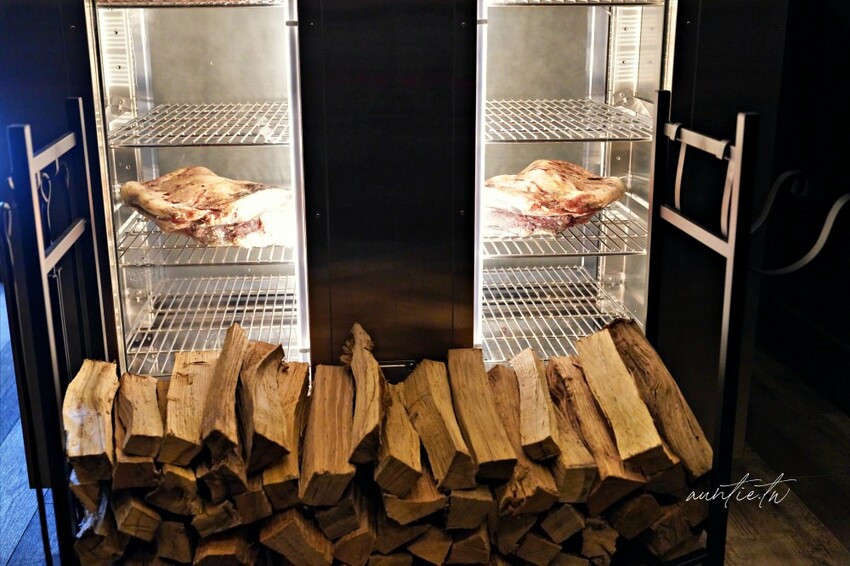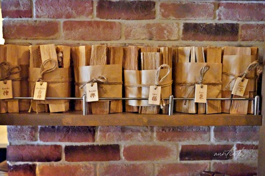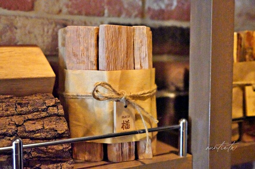 Vesta 的店面是低調成穩的深藍色系,一進到店裡就可以看到一台要價不菲的熟成牛排櫃,專門用來熟成頂級A5神戶牛。最特別的就是店內陳列的多種不同木材,櫻花木、櫸木、樺木、檜木、栗木、楢木,每天使用的木材不一定相同,用餐這天使用的是楢木,查了一下就是橡木的一種,除了用木材材燒的方式燒烤神戶牛外,還會透過煙燻,讓食材染上木材獨特的香氣,比單純透過鐵板料理的吃法,更多了新奇的新鮮感!線上訂位