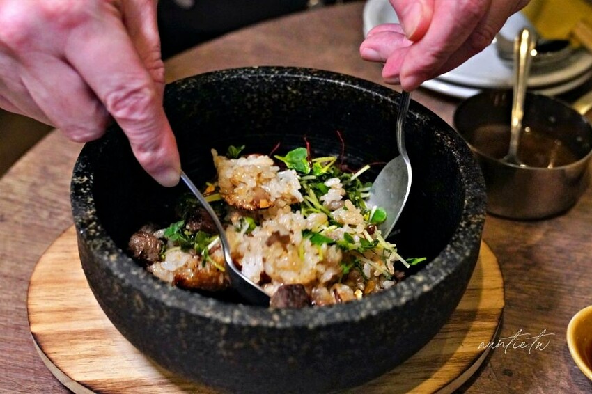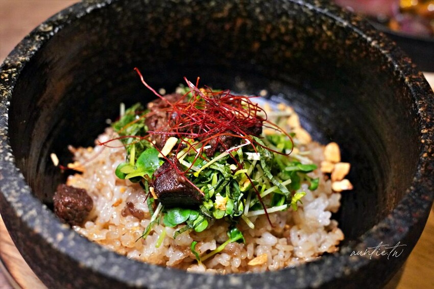 主食則是神戶牛筋石鍋拌飯,底部有酥脆的鍋巴,還有神戶牛油脂的香氣,另外還加入了蒜片,攪拌時香氣非常濃郁,雖說吃完牛排已經飽到不行了,但這道牛筋石鍋拌飯才品嚐一口,又忍不住把整碗吃光光。