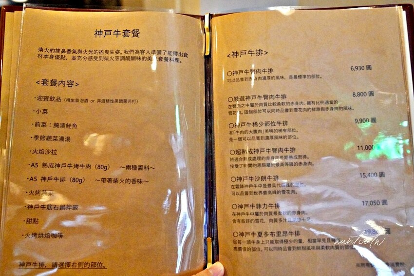 Vesta的餐點都是以套餐方式呈現,晚餐套餐從前菜、季節蔬菜濃湯,主餐:A5熟成神戶牛排、A5神戶牛排(柴火)、火烤蔬菜、神戶牛筋石鍋拌飯、甜點與咖啡,一次可以吃到熟成肉以及柴火燒烤的神戶牛,點餐方式非常簡單,其實只要選擇主餐要哪一個部位的神戶牛排就好了,Vesta提供的都是A5等級神戶牛,這次點了神戶牛稀少部位牛排。