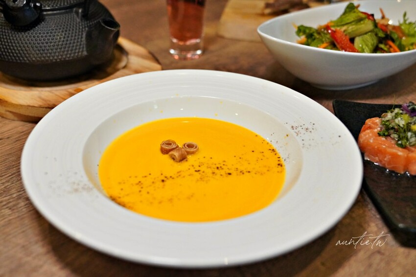 剛剛先喝了氣泡酒,吃完神戶牛抹醬法式吐司和前菜後,第一道上的是暖暖的季節蔬菜濃湯,超濃郁的南瓜湯以超保溫的鐵壺承裝,用餐時服務人員會將南瓜湯倒入盤中,加入帶有煙燻香氣的烤麩,喝起來有南瓜自然鮮甜味,濃郁香甜非常暖胃。
